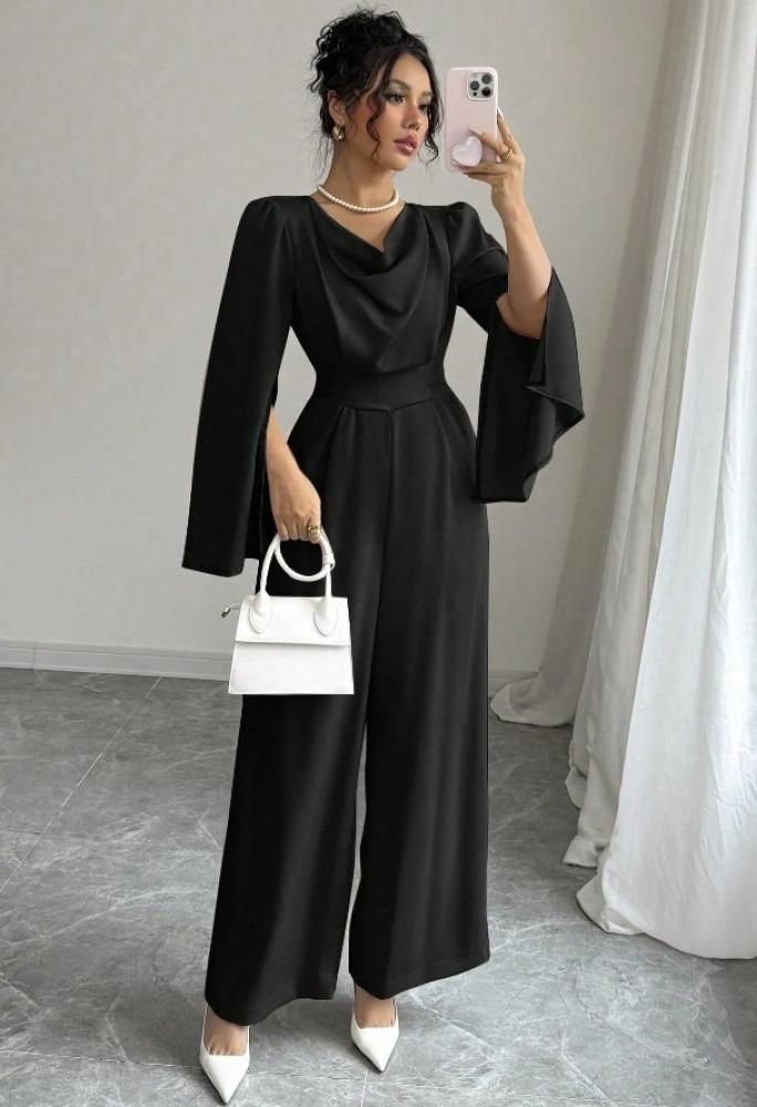- جمبسوت اسود فخم يمكن تنسيقه مع إكسسوارات متنوعة لمظهر أكثر تألقًا.