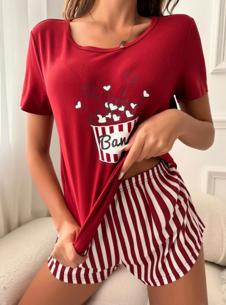 استمتعي بأناقة عصرية وراحة مثالية مع طقم بيجامة مطبوع بالحروف والخطوط، بتصميم جذاب يناسب أوقات الاسترخاء والمنزل بإطلالة مرحة وأنثوية.